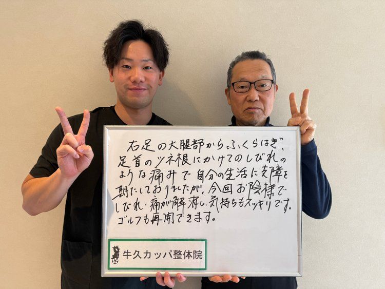 右足の大腿部からふくらはぎ、足首のつけ根にかけてのしびれのような痛みで自分の生活に支障をきたしておりましたが、今回お陰様でしびれ、痛みが解消し気持ちもスッキリです。ゴルフも再開できます。